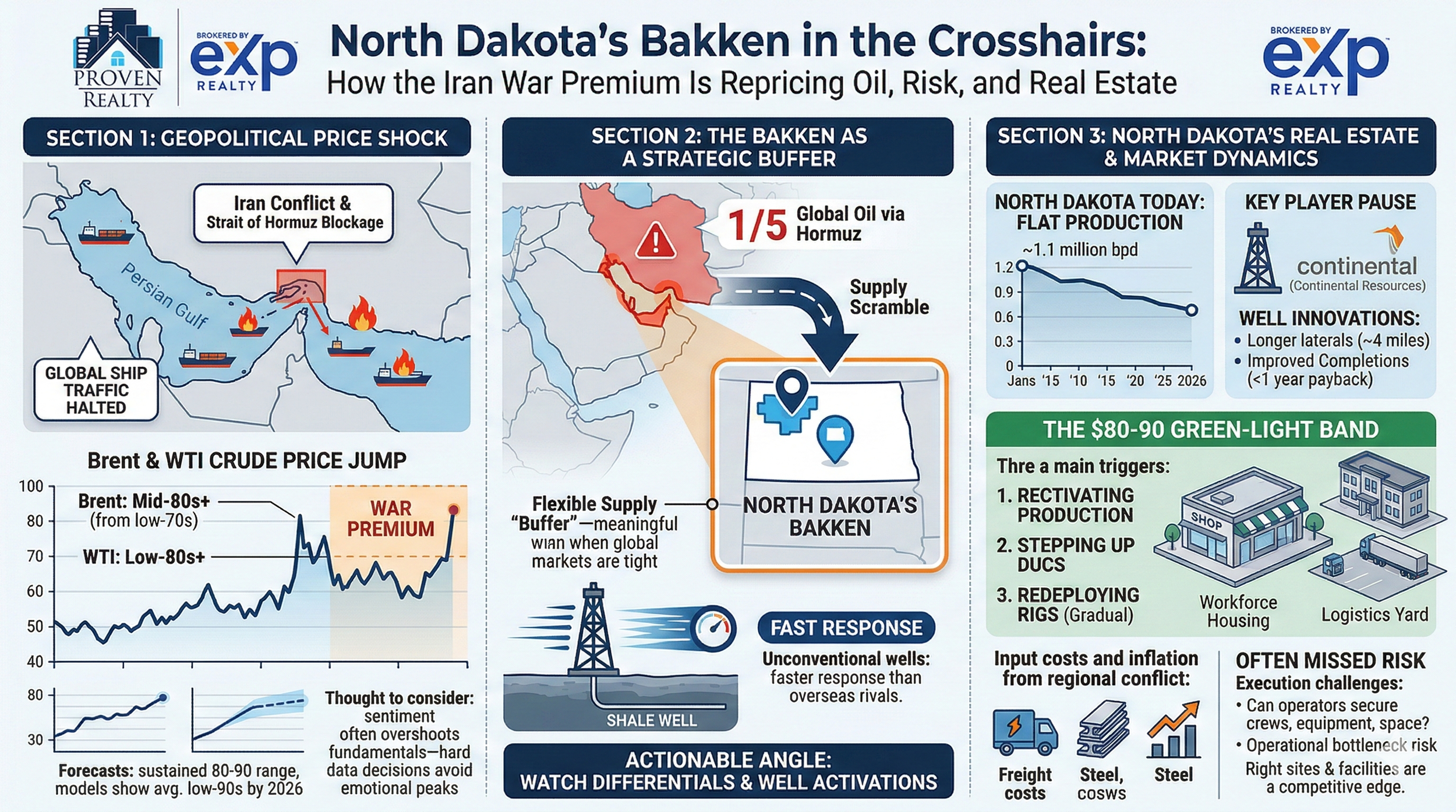 The Iran conflict is creating a short‑term price shock in global oil while turning North Dakota’s Bakken into a strategically important “pressure valve” for supply, even though local production has been flat to declining in recent months. From the perspective of our team at Proven Realty, that combination of geopolitical risk and regional opportunity is exactly when disciplined, data‑driven decisions about Bakken real estate matter most.